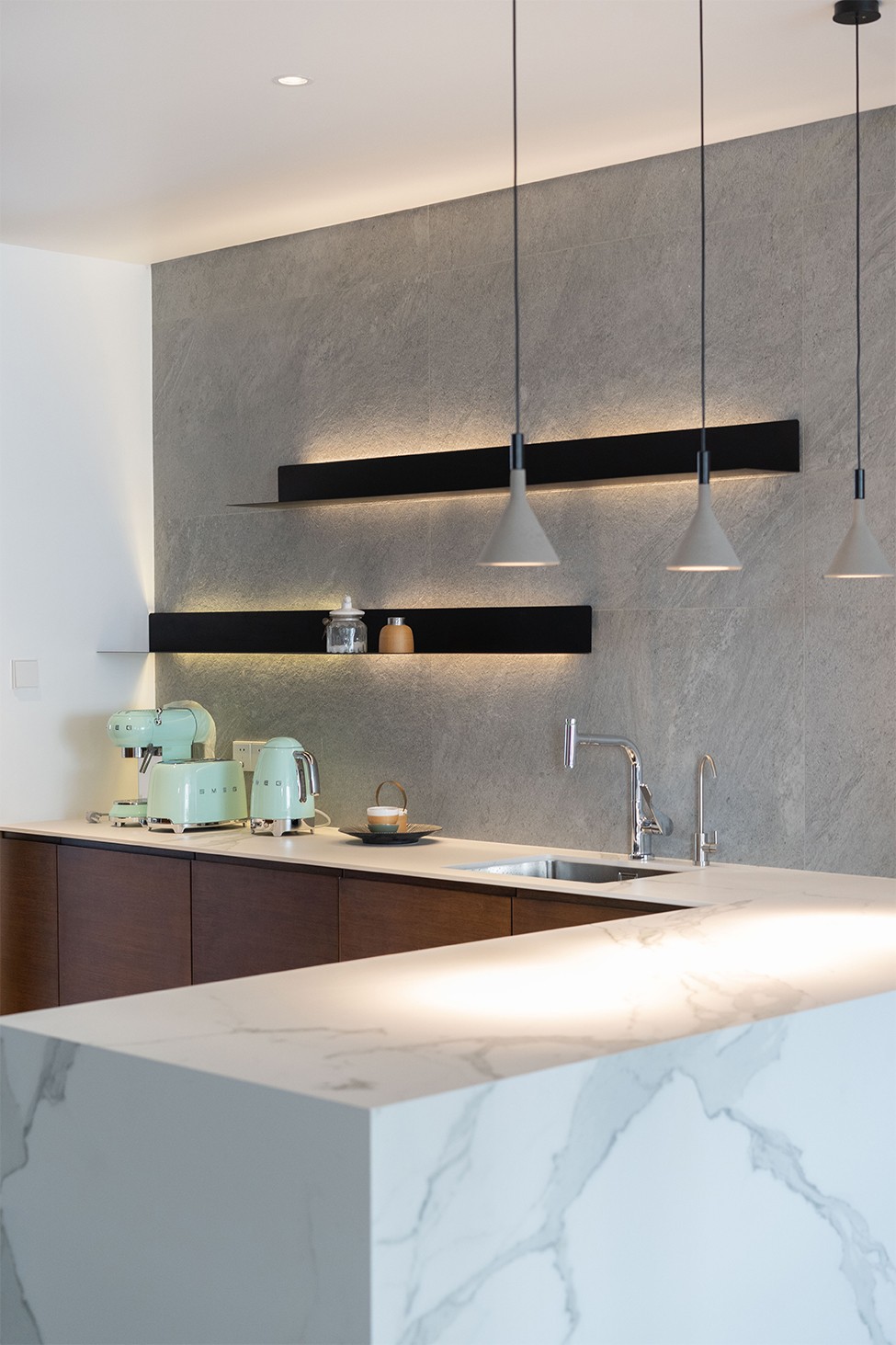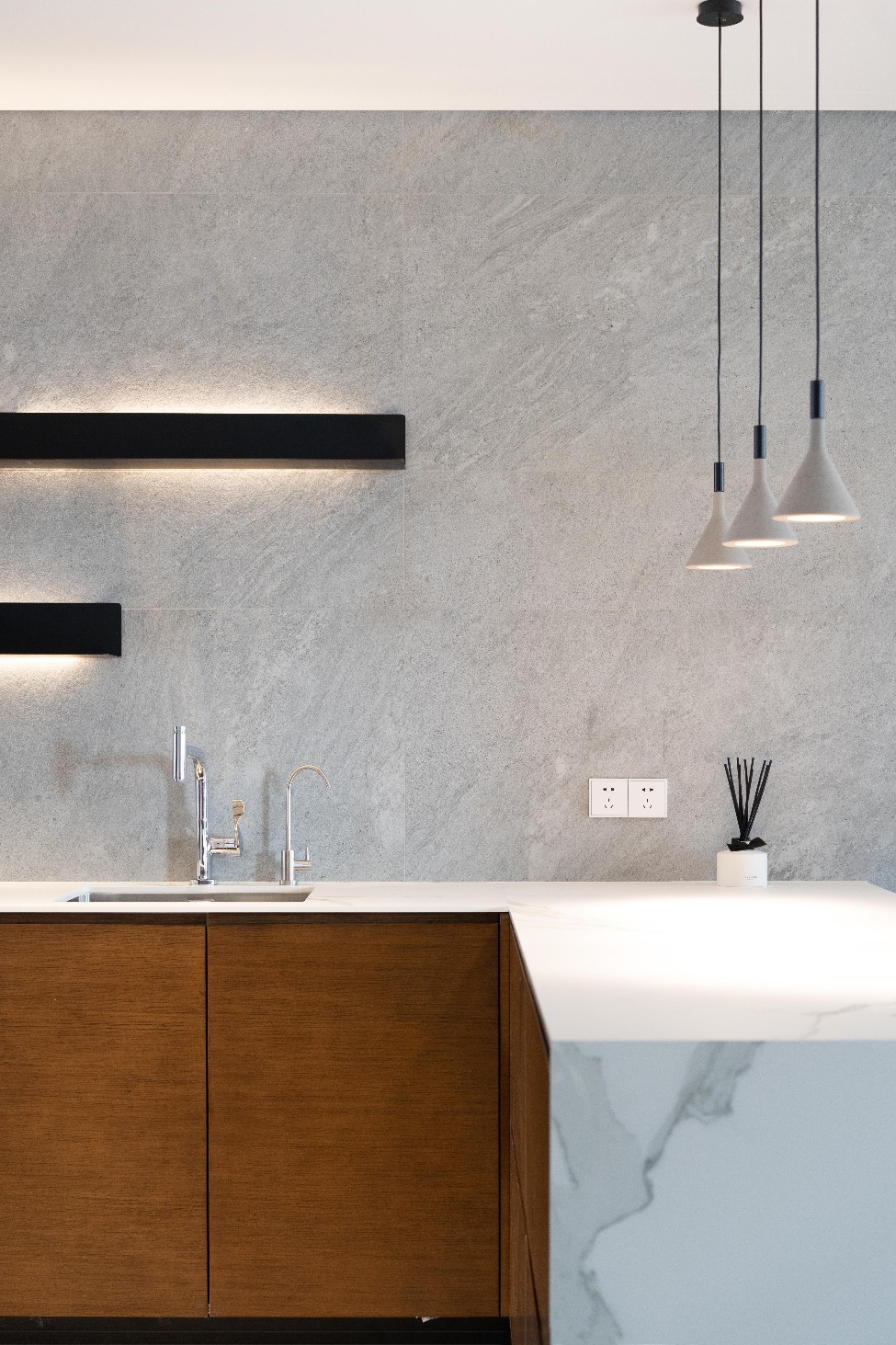 极简的舒适感,中厨与西厨相互贯通,西厨既可以做厨电的收纳区,还可以做烹饪辅助区,西餐爱好者,在这样一个区域加上中岛,基本上就能完成所有的烹饪过程,非常的方便。